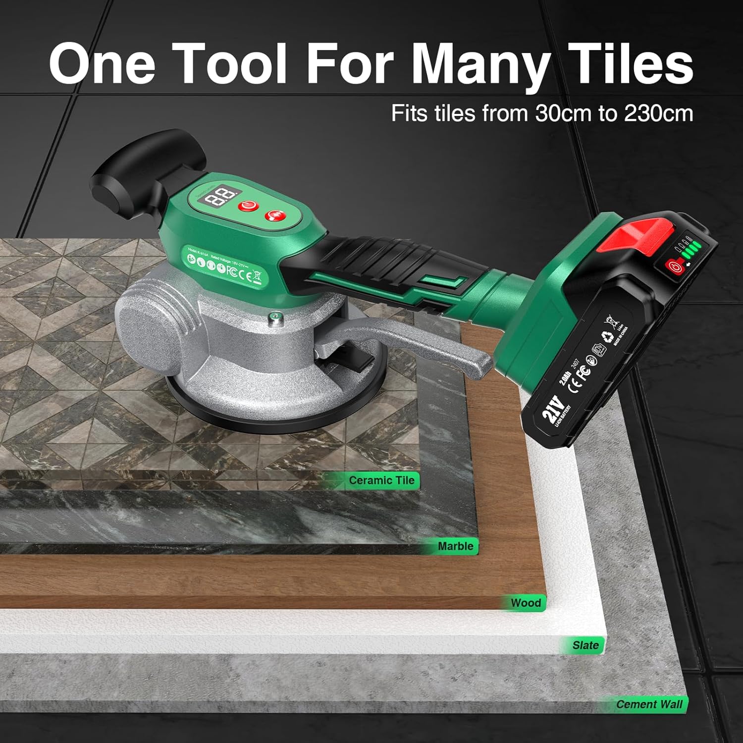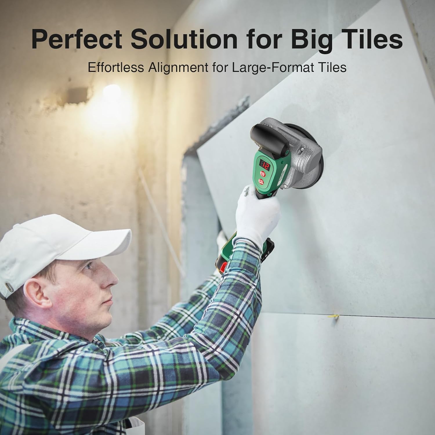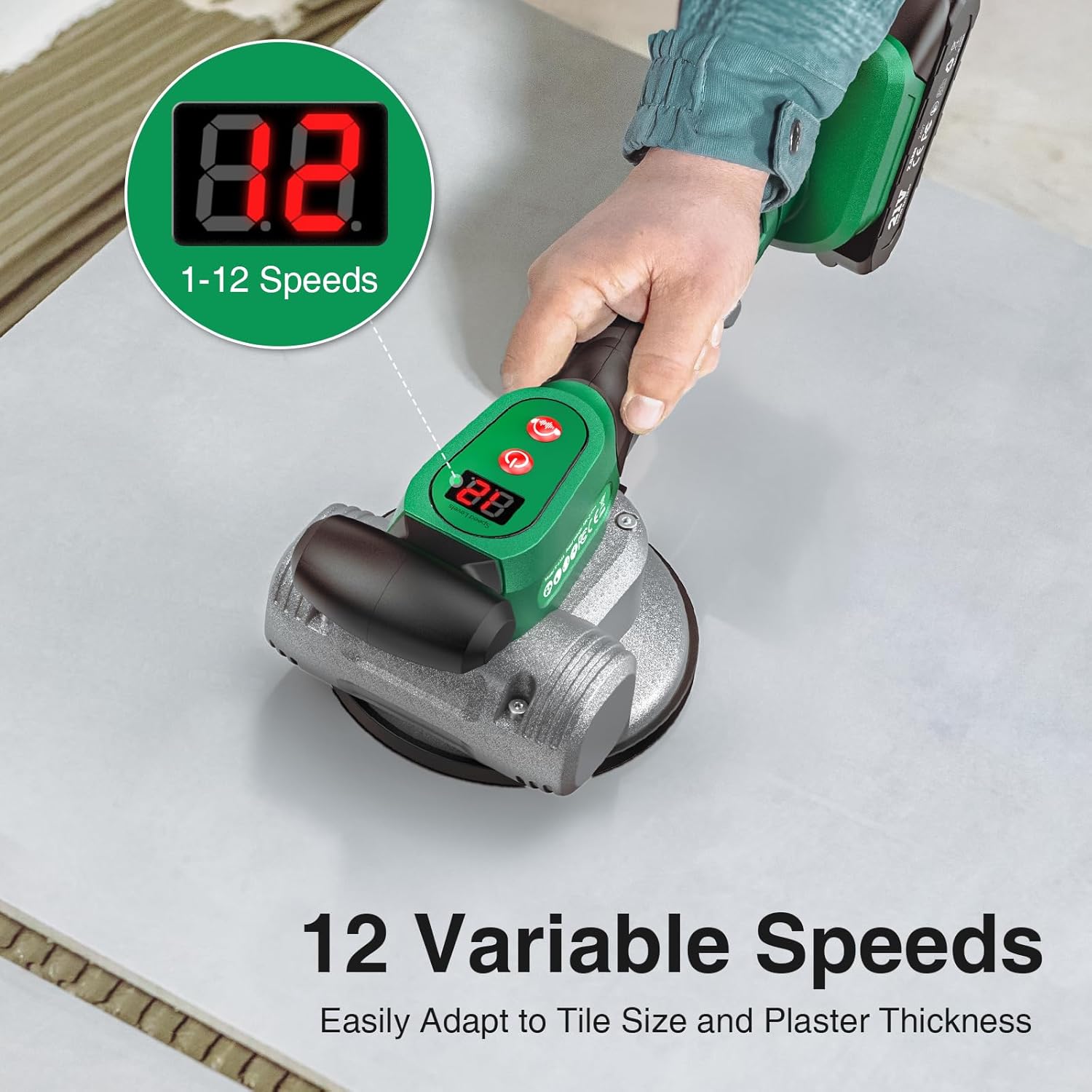 Cordless Tile Vibration Tool with Two 2.0Ah Batteries (Lasting 6 Hours), Featuring 12 Adjustable Levels, a Tile Suction Cup, And Designed for Installing Large Tiles on Floors And Walls in Bathrooms.