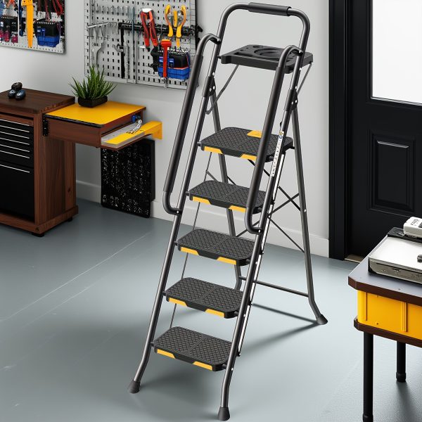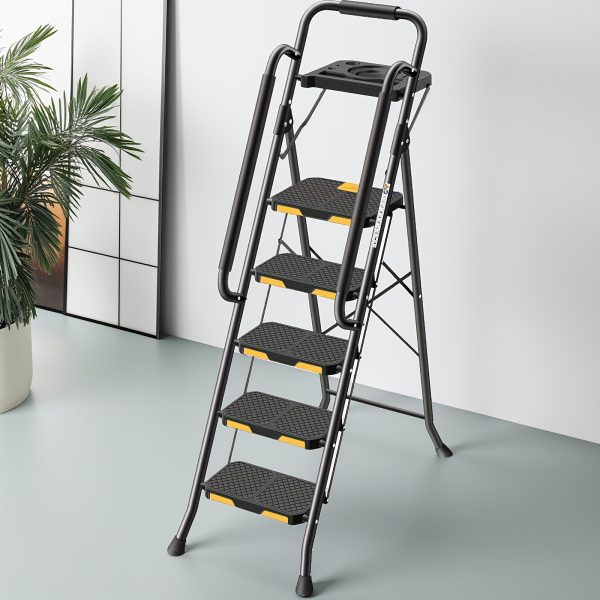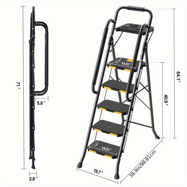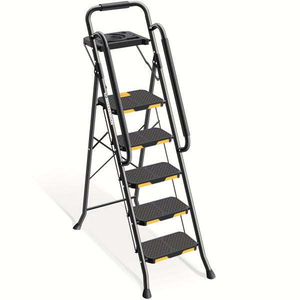 - KINGRACK 5 Step Folding Ladder With Handrails & Tool Platform, Heavy-Duty Steel Ladder For Home, Outdoor & Garage, 800 LBS Capacity, Black