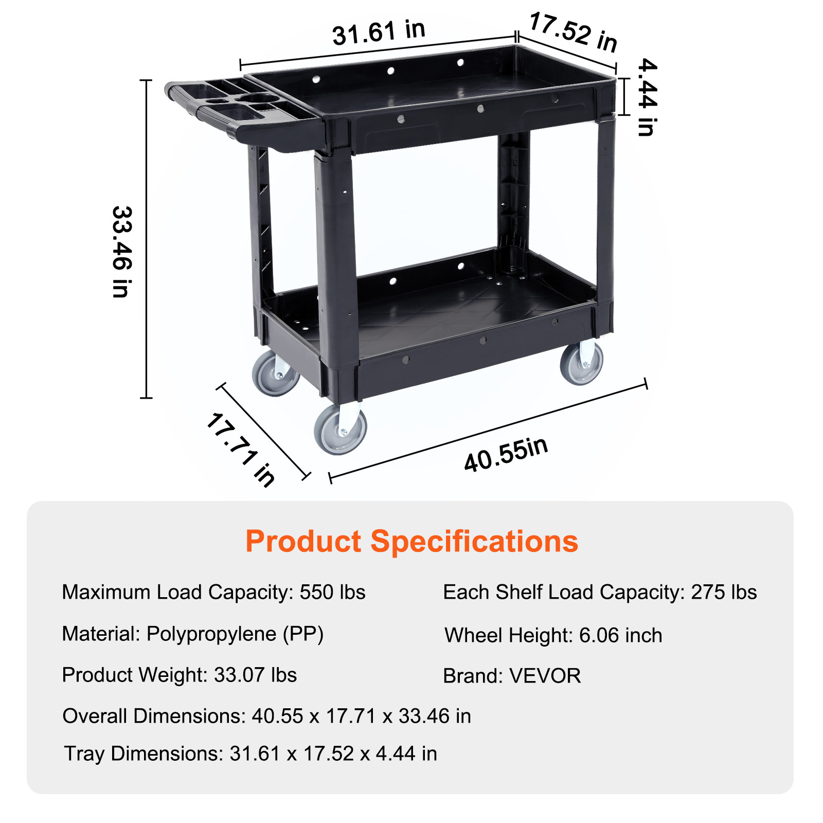 Strong Weight Capacity: VEVOR 2/3 shelf utility cart can effortless transport 550 lbs heavy loads. such as oversized cartons. large filing cabinets. and hefty toolboxes. Quality polypropylene material is corrosion-resistant. impervious to debris. and easy to clean. High-density structural foam construction makes this utility cart sturdy. lightweight. and maneuverable. ideal for long-term heavy-duty transportation needs.